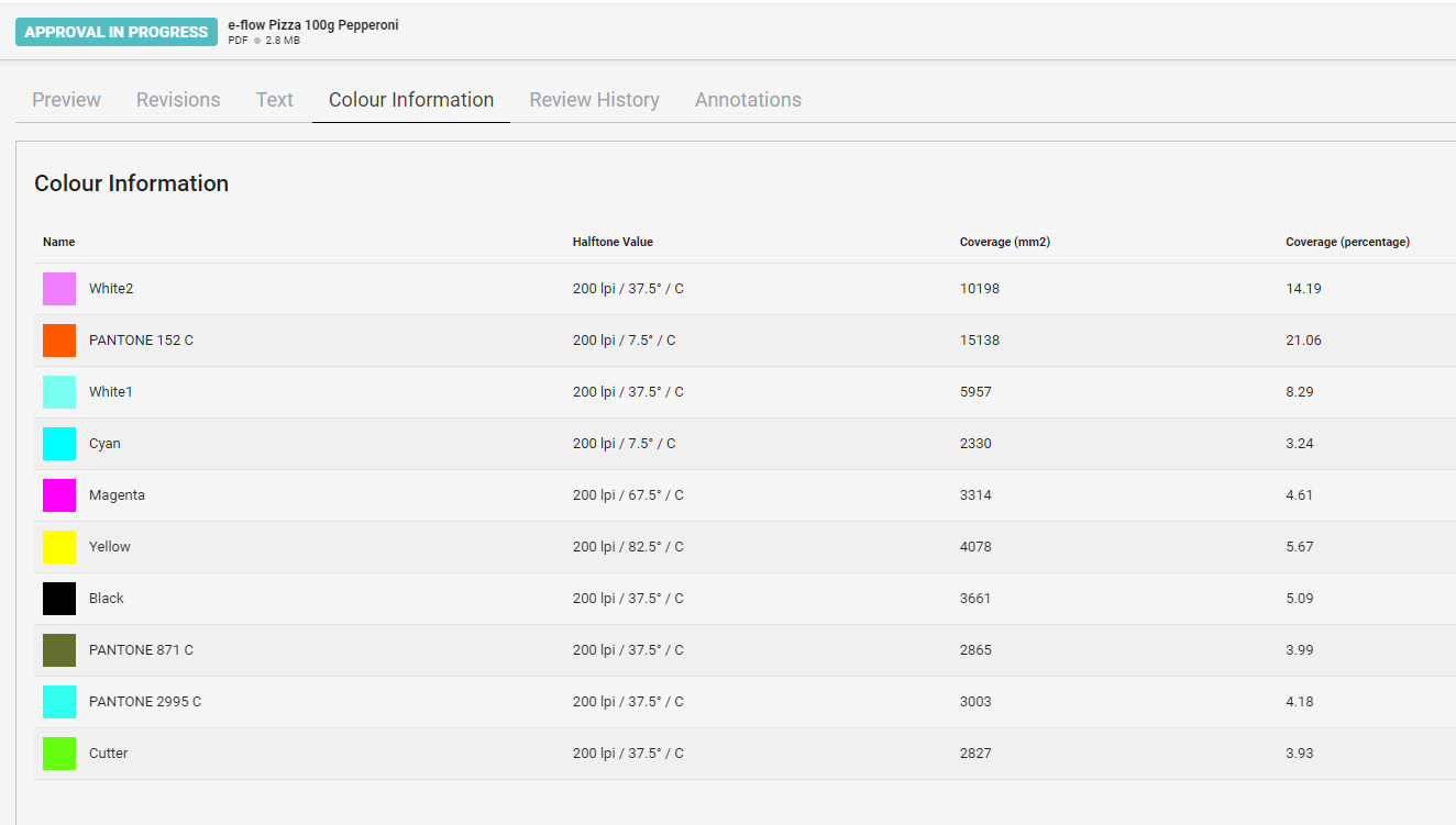 Within this tab you are presented with all of the colours used on the Asset, along with a range of metadata relating to each colour.