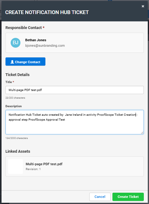 Clicking on this button will display a modal containing details from the approval session, auto populating the name and discussion text and linking the associated asset and activity from the approval task. The user creating the ticket only needs to select a responsible contact to complete the create ticket process.