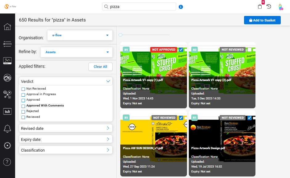 When using Global search, and refining the results by 'Assets', users are now able to select the assets they would like to add to their e-flow shopping basket. Selecting the required assets is done by clicking the box in the top right corner of the thumbnail which is adjacent to the approval verdict of the asset.