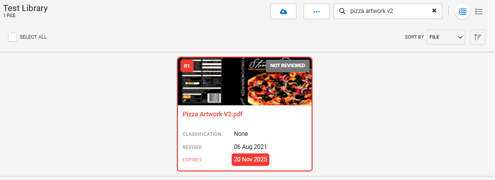 Viewing the library in Grid View will show a thumbnail of the asset with a red border, the asset name and expired section also in red: