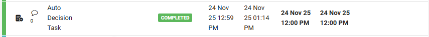 The Auto Decision task is identified by a new icon, there is no task assignment associated with the task, the task will auto complete once it is triggered in the workflow template and no additional actions can be actioned on this task.