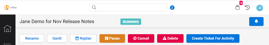 When an activity has a running notification ticket associated with it, a new bell icon will display in the activity status bar as follows: