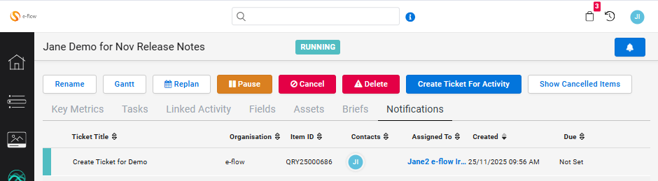 Clicking on the bell icon will open the notification tab in the activity to display all notification tickets:
