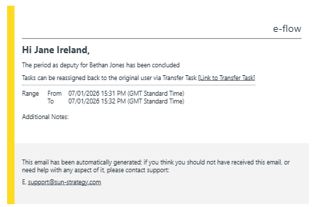 When an absence has ended, either because the absence has been cancelled manually or the end date of the absence has elapsed, the delegate user will receive an email to make them aware the the absence has concluded.