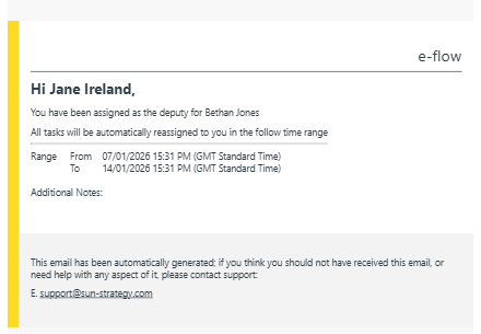 When setting an absence in e-flow, the user who has been assigned as the delegate will now receive an email so that they have full awareness of another users absence and when they can expect to receive additional tasks.