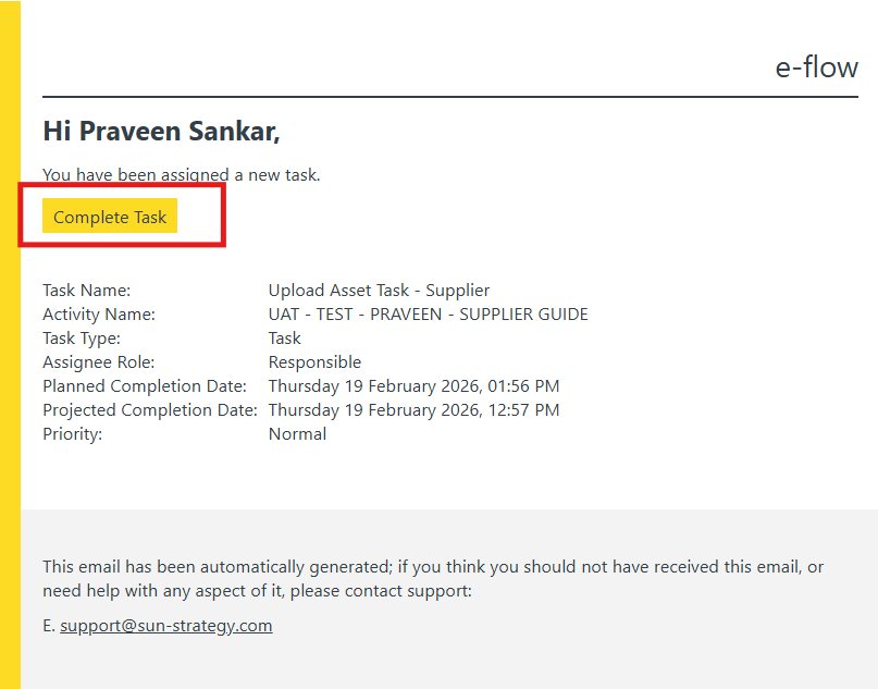 Once a task is started in e-flow and assigned to you, you will receive a notification e-mail containing a link to access and complete the task.
