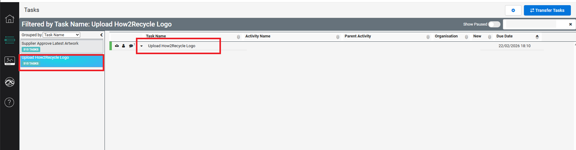 After logging in to e-flow and navigating to the Task page, please open the "How2Recycle Logo" task as shown below.
