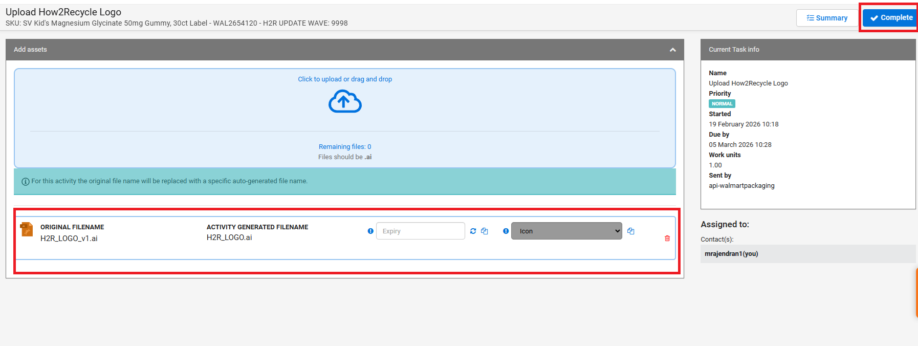 Please click the ✓ (Approve) button if the artwork is the latest version and the H2R logo needs to be updated. After clicking ✓ (Approve), please click Complete to finalise the task.