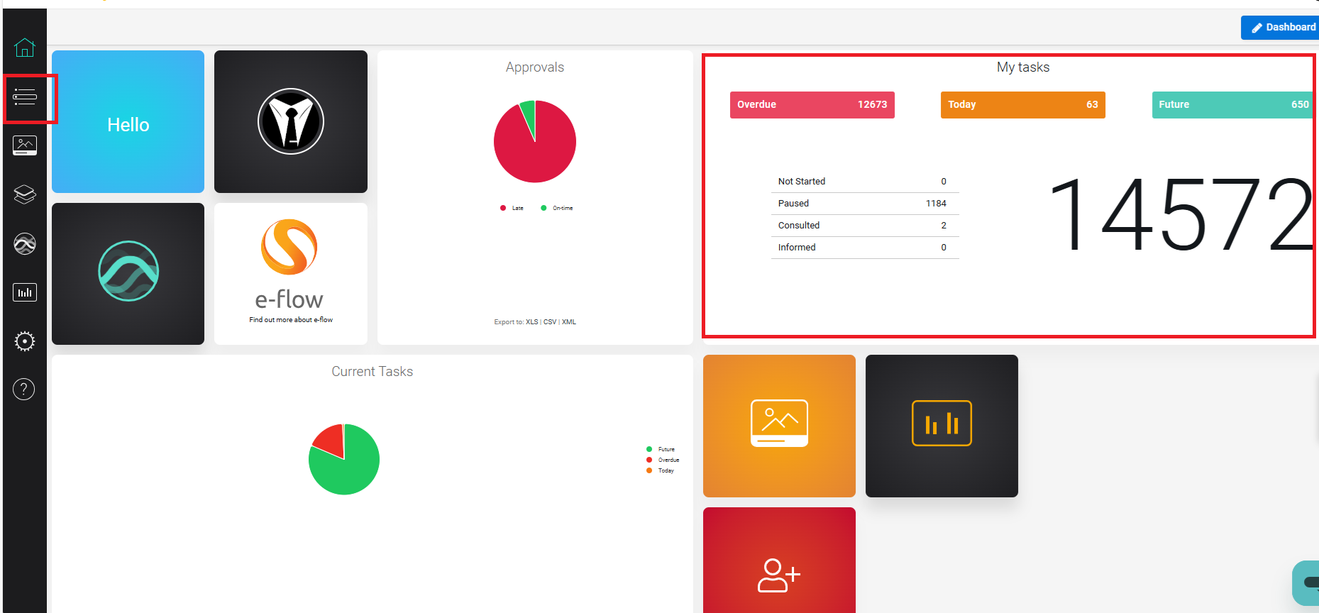 Once logged in to e-flow, the home page will be displayed as shown below. You can access the Task page by either clicking on the ‘My Tasks’ widget or selecting the ‘Task Hub’ from the menu.