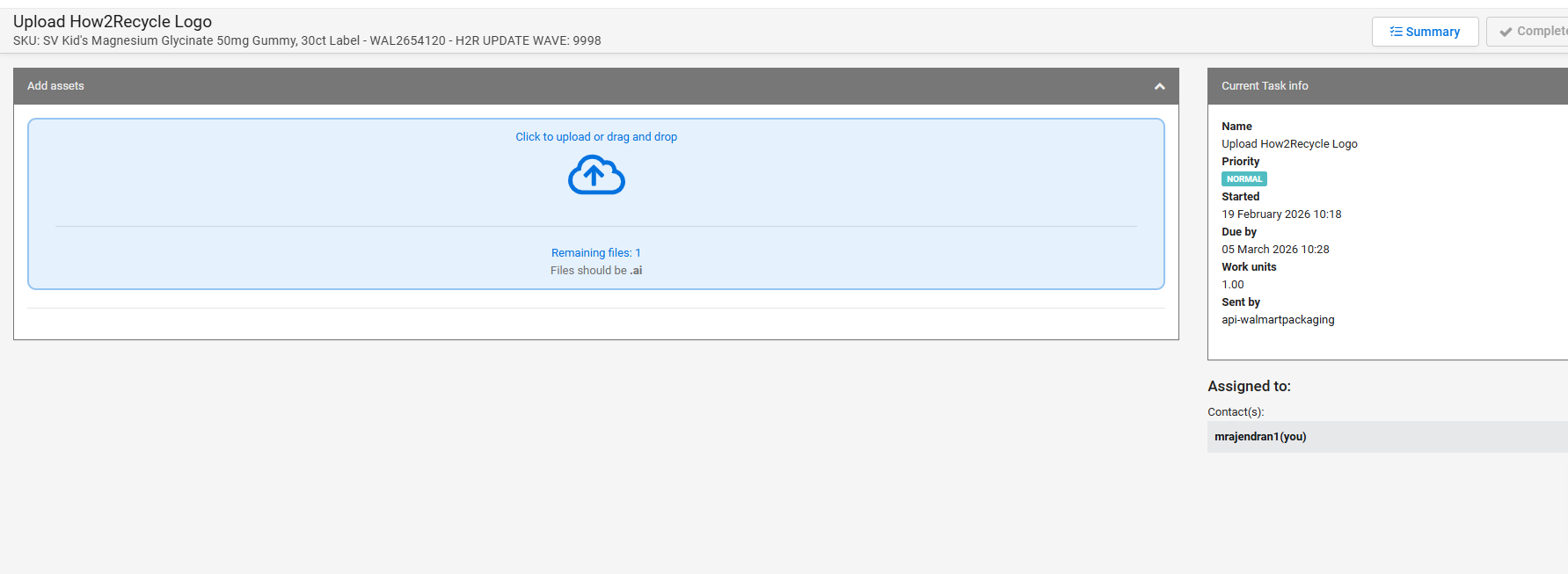 After you approve the previous artwork (Supplier Approve Latest Artwork) and upload the H2R logo, the file will be processed by the team. The artwork will then be updated to include the H2R logo and sent to you for approval under the task Supplier Approve Updated Artwork.