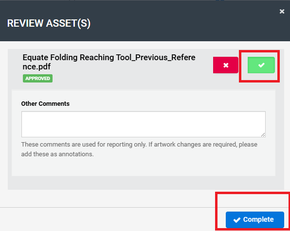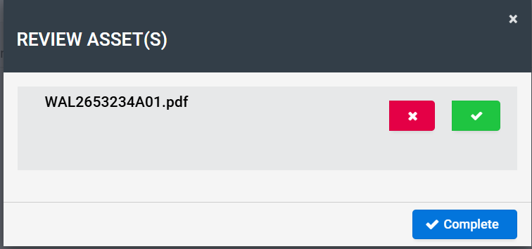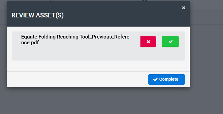 After clicking Complete, the below pop-up will appear. Please click the ✓ (Approve) button to approve the task. If you wish to reject the ticket, click the ✕ (Reject) button instead.