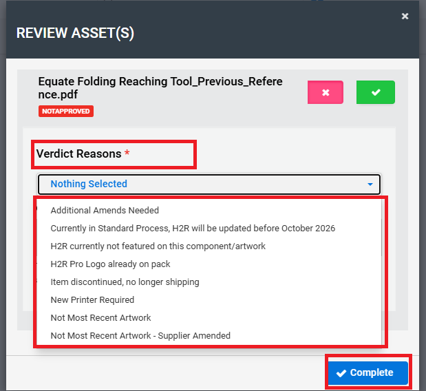 Once you click the ✕ (Reject) button, please select the appropriate Reject Reason from the Verdict Reasons dropdown, then click Complete to finalise the task.