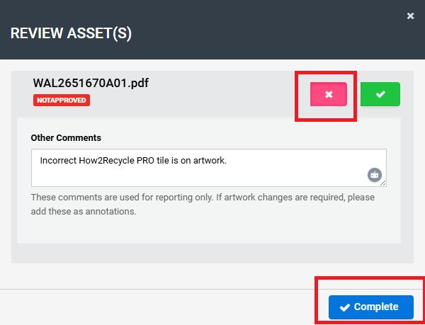 Please click the ✕ (Reject) button if the How2Recycle® PRO logo has not been updated correctly. Once you click ✕ (Reject), please add your reasons to the Other Comments box below and click Complete to finalise the task. An example reason is shown below.