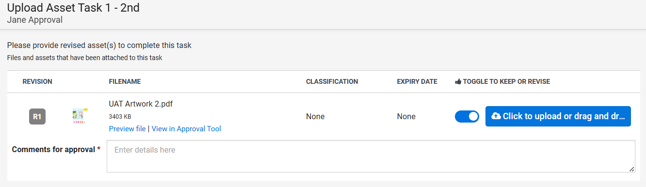 If the feature flag has been enabled, when completing a revised upload task the user will see a new field underneath the asset called 'Comments for Approval':