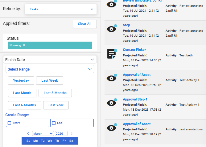 Users can now refine search results by a task’s finish date. For tasks that are still active (Running, Paused, or Pending), the filter uses the projected finish date. For tasks that are Complete or Cancelled, it uses the actual finish date instead.