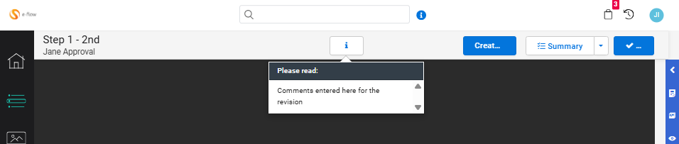 Any text entered into this field is then automatically visible to the approval user(s) when completing the review, pressing the 'i' button will minimise the message.