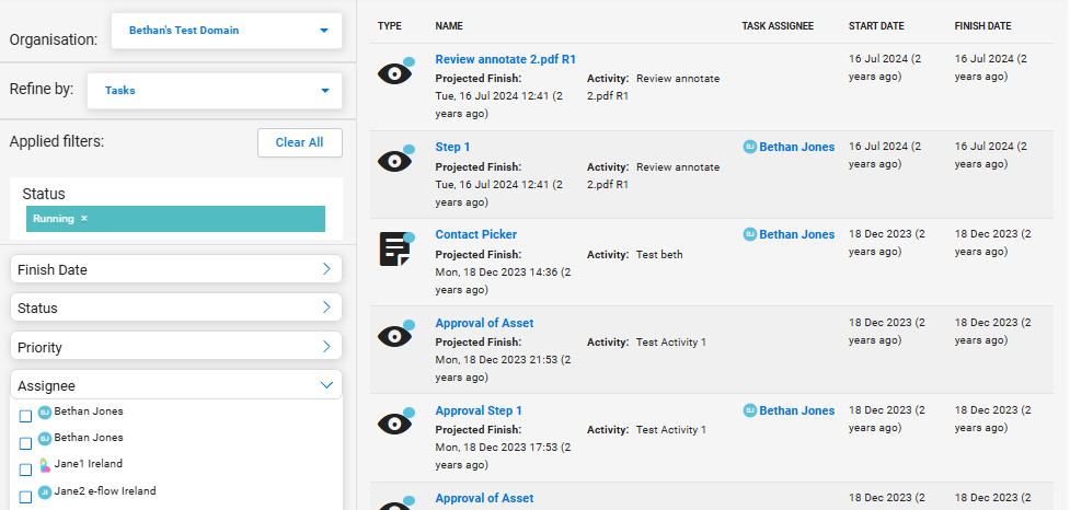 We’ve enhanced the Refine by Task search results to include the task assignee directly in the results table. We’ve also added a new filter that lets users narrow their search by a specific assignee, making it easier to find the tasks they need. Refining by tasks also now prefilters the results to only show running tasks, any other status can be added using the 'Status' filter options.