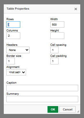within the rich text field on a form, the 'Table' button has been added. When clicking on this table icon, users are able to add a table using the below control: